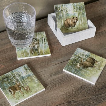 A coordinating set of four wooden coasters displaying vivid hand painted scenes of woodland animals surrounded by trees. Each coaster features individual designs including a bear, moose, deer, and owl in a forest inspired color palette. Our Woodland Animals coaster set includes a white wooden holder to store coasters and comes packaged with jute rope tied around set. A rustic everyday home accent perfect for adding functional style any room.