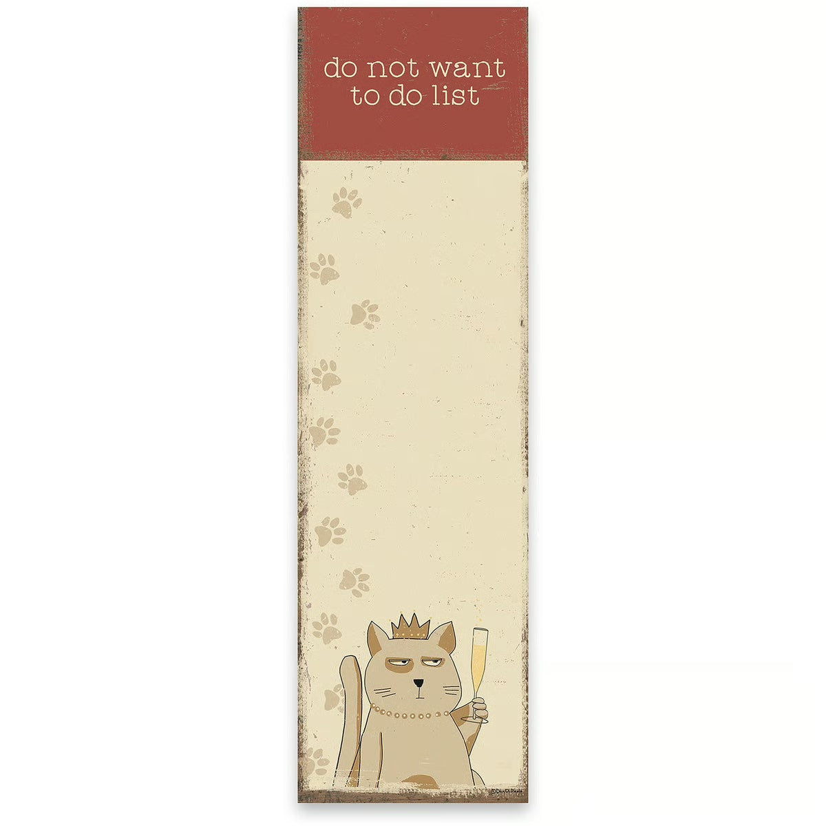 A list notepad displaying a rustic pet-themed design featuring a sassy cat with champagne and humorous "Do Not Want To Do List" sentiment. Includes 60 pages and a strong magnet to easily display on magnetic surface. Our Do Not Want To Do List list pad is proudly made in the USA. A charming everyday accessory perfect for any space.