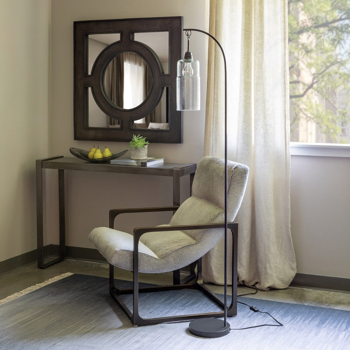 Cleans lines make up our glass pendant floor lamp. In a sleek black finish it features a hanging pendant light. Perfect for those looking for a unique lighting option. Where industrial and style meet. A look we love!