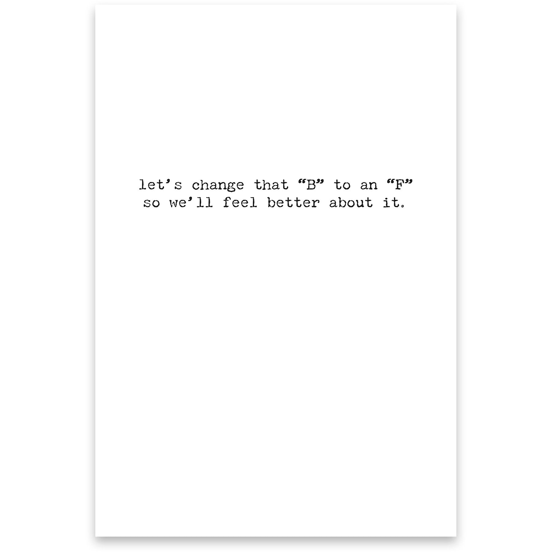 A humorous greeting card displaying a vintage photograph with complementing sentiments. Card features "We're Not Making Any Progress On Our Bucket List..." sentiment on the outside and "Let's Change That 'B' To An 'F' So We'll Feel Better About It." sentiment on the inside with space to add a personalized message. Our Progress On Bucket List greeting card is a hilarious gifting option for everyday moments. Proudly made in the USA.