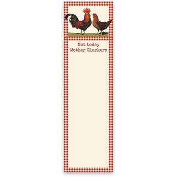 A list notepad displaying a vintage design of a rooster and chicken with red gingham pattern around writing space and punny "Not Today Mother Cluckers" sentiment. Includes 60 pages and a strong magnet to easily display on magnetic surface. Our Not Today Mother Cluckers list pad is proudly made in the USA. A fun everyday accessory perfect for any space.