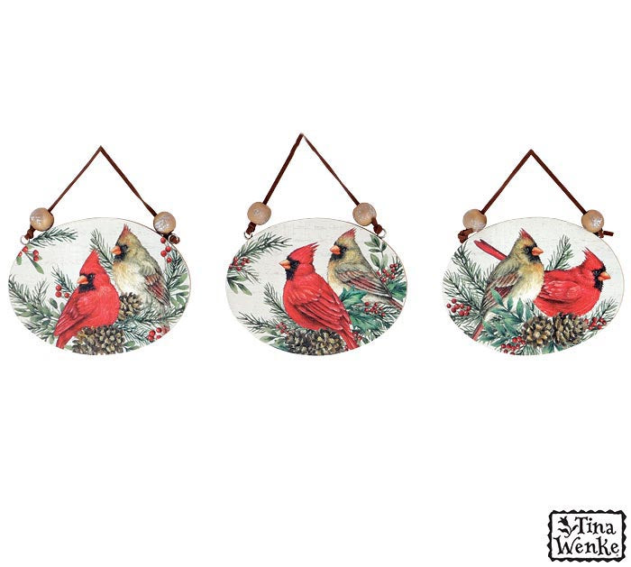Oval wooden cardinal ornament. Design of cardinal couples perched on a holly branch with a white background. Ornaments have brown suede hangers with distressed bead accents. 3.5"H X 4.5"W, 8" Hanging