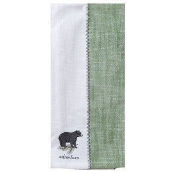 Keep it simple while you add a big statement with this woodsy linen-look tea towel. Embroidery, center stitching, and a two tone woven design will deck out the lodge themed kitchen.
