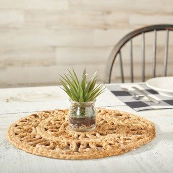 A placemat made from braided jute to create a unique sunburst design. Perfect option for adding a natural feel to the table. Our Sunburst placemat is also designed to easily hang on the wall for bohemian style décor. Spot clean only.