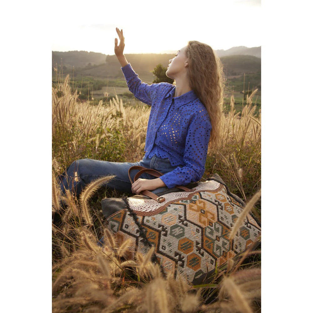 A center panel of gorgeous upcycled woven rug sets the tone for this beautiful bag. Smoky charcoal woven canvas is featured on one side and on the back. Accents of stamped gator-look leather in bourbon cream and warm caramel leather add the perfect touch. Frayed-hem seams, a zipper-close top and sturdy leather carrying straps complete this remarkable bag..