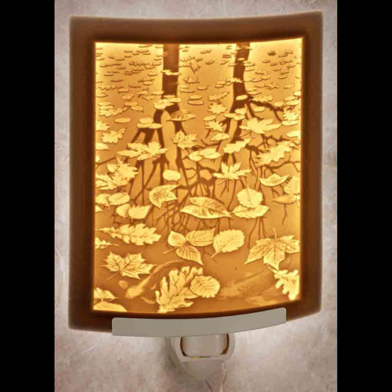 This is a "lithophane"; a thin translucent porcelain night light, made using a lost art from the 1800's. When lit from behind, the light shining through the different thicknesses of the carving causes a highly detailed image to appear in front, almost magically. As you see, the illuminated image is so detailed, that it has a totally photographic quality to it! In addition, the relief of the carving gives the image a 3 dimensional quality when seen in person. To make them, we start by carving the image in a translucent wax, with the wax lit from behind. We then take a plaster mold of this engraving, and we then cast a fine porcelain clay into this mold. We then kiln fire the porcelain to 2300 degrees F. to achieve it's translucency and durability. Lithophanes were invented in France in 1827, and were popular throughout Europe till the early 1900's. They mysteriously faded from popularity with the advent of electricity, which is ironic as they look way better with electric light than candles. We first started making them 32 years ago by reproducing the antique ones. We eventually learned how to engrave our own originals, and this has been our specialty ever since. Our lithophanes truly make for a beautiful and practical piece of art that you will use daily for year after year! This night light has a fascinating multilayered dimensionality to it. Note the fish in the water in the foreground, then the leaves are floating on the water, while the trees are reflected in it. Stunning!