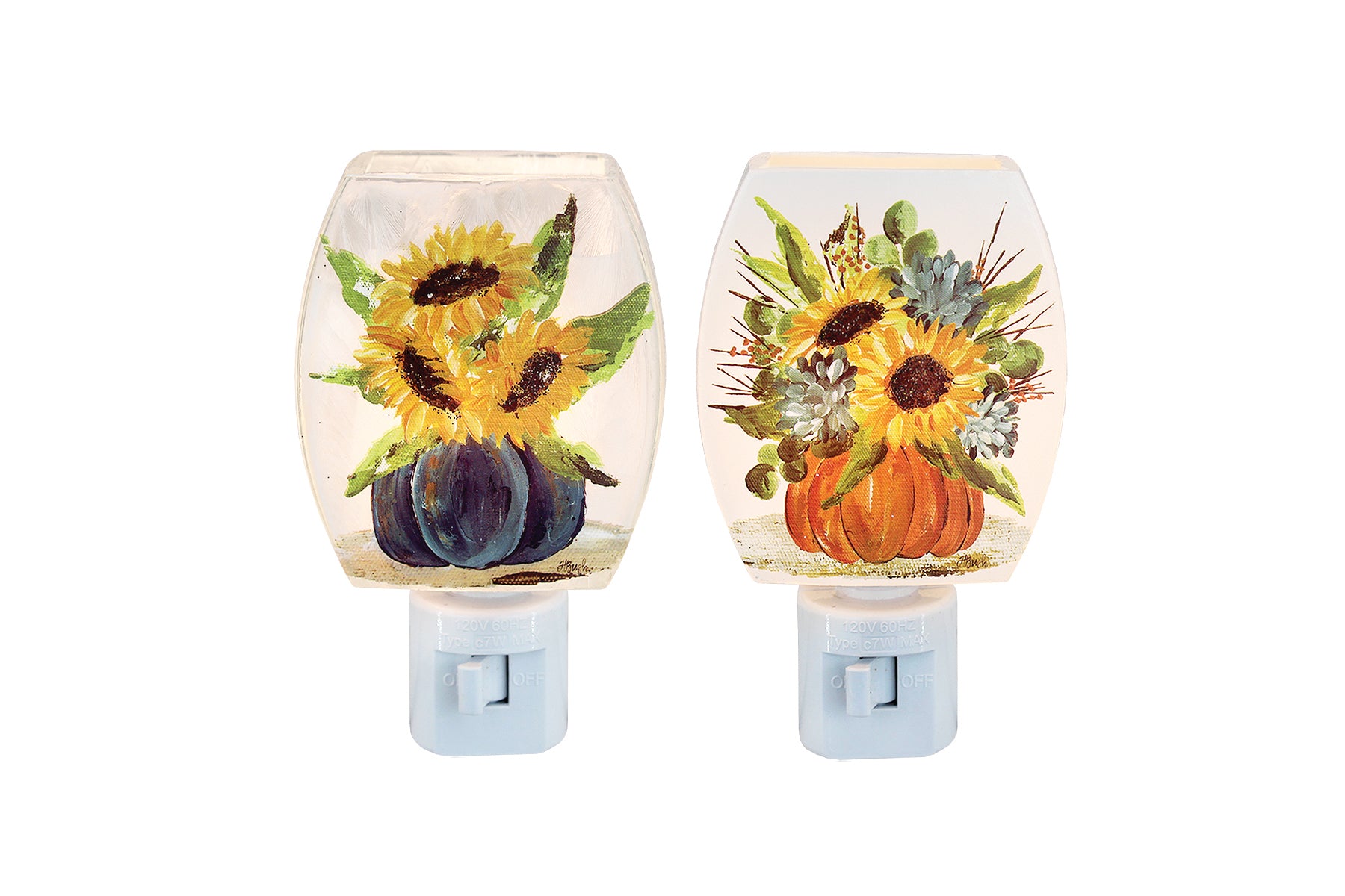 This Sunflower Night Light features beautiful sunflowers and a pumpkin on the front, adding a touch of whimsy to any room.