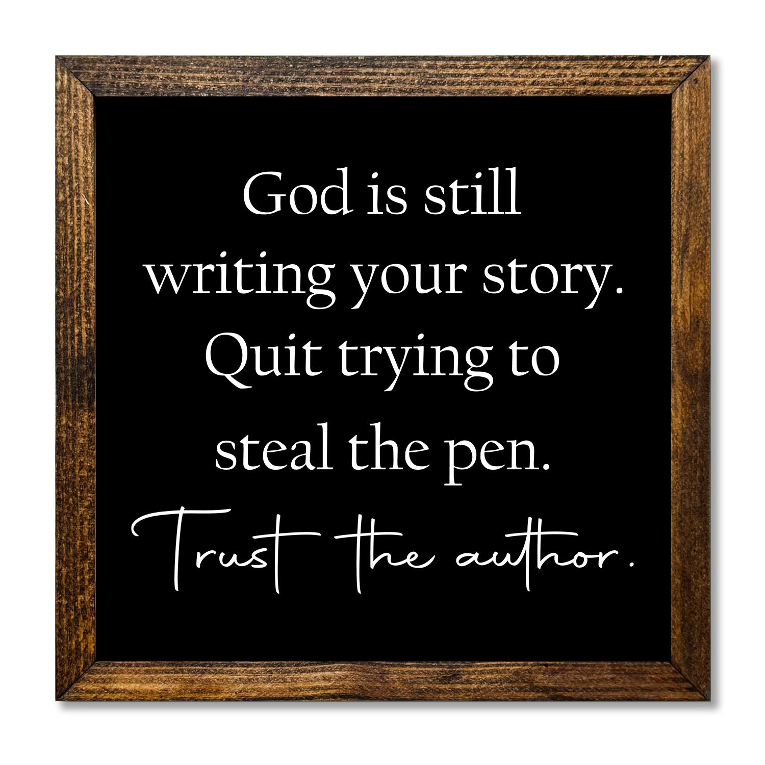 Timberland frame with they saying 'God is still writing your story. Quit trying to steal the pen. Trust the author."